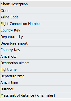 SELECT mandt carrid CONNID COUNTRYFR CITYFROM AIRPFROM COUNTRYTO CITYTO AIRPTO FLTIME DEPTIME ARRTIME DISTANCE DISTID FLTYPE PERIOD