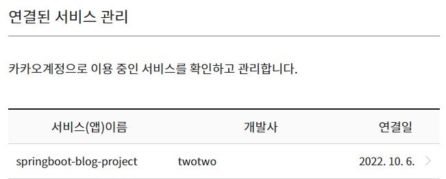 카카오 계정 설정 - 디벨로퍼스 프로필 정보 - 카카오 계정정보 확인하기 클릭 - 계정 이용 - 외부서비스 전체보기 클릭