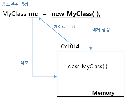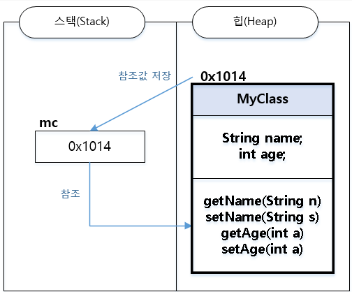 생성 된 MyClass 객체를 mc가 참조를 하고 > mc.