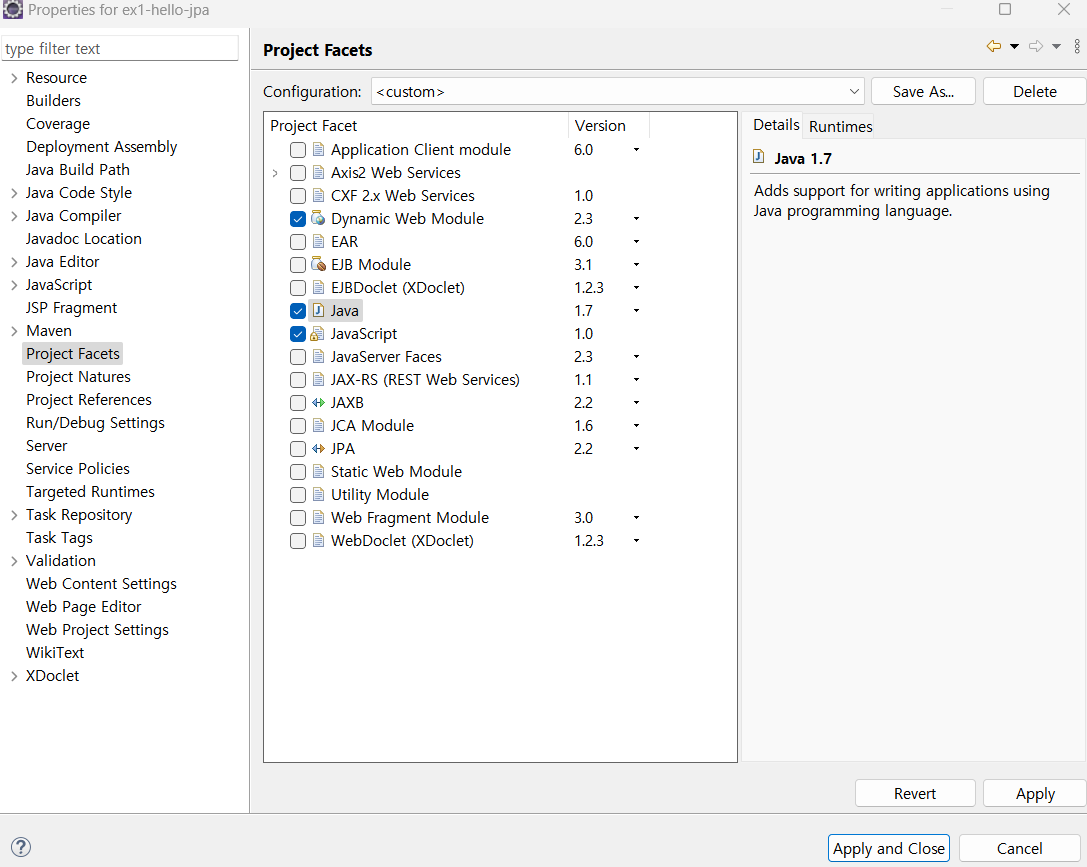 Project Facets 의 자바 버전을 확인