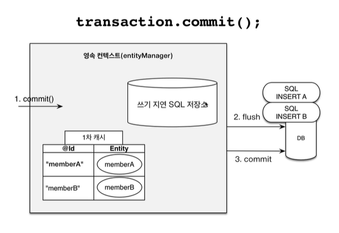 커밋하는 시점에서 쓰기지연 SQL 저장소가 DB에 flush 해서 쿼리문이 반영이 된다.