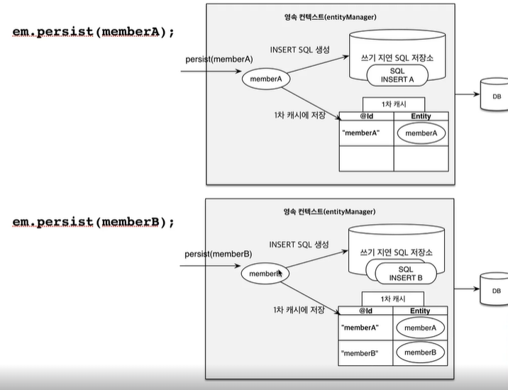 쓰기지연 SQL 저장소에 memberA, memberB의 INSERT 문(쿼리문)이 저장이 된다.