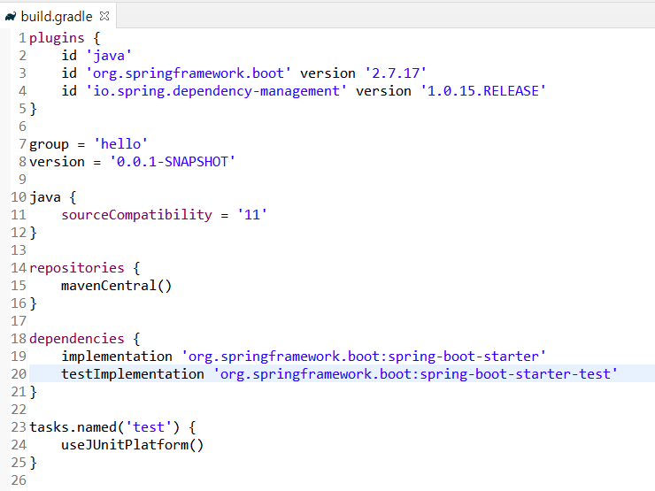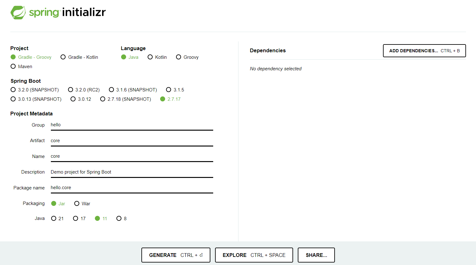 - 의존관계를 아무것도 선택하지 않으면 스프링 코어쪽 라이브러만 간단하게 구성해줌