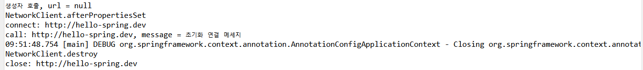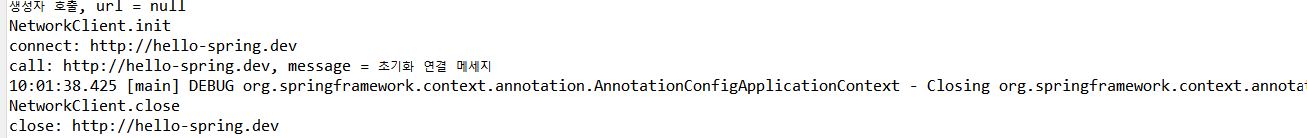 //(이미 LifeCycleConfig을 스프링 컨테이너에 넣었고 networkClient()에서 NetworkClient 빈을 등록했기떄문에 조회만 함)