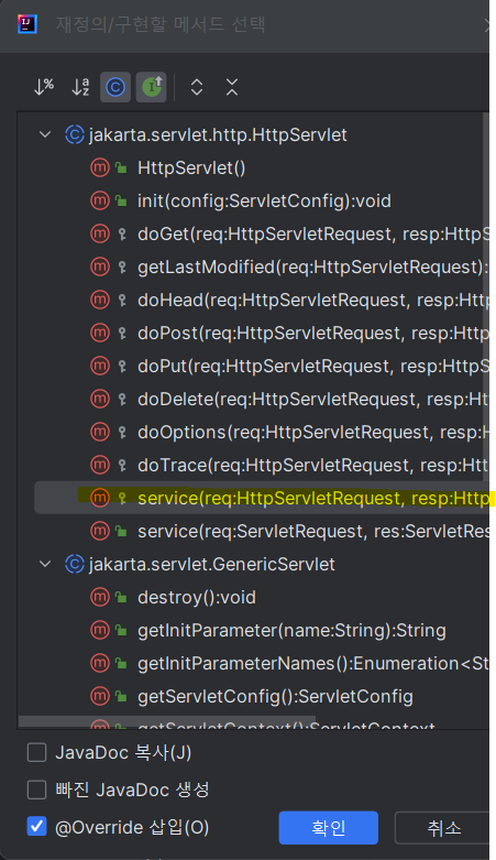 ctrl + O 하면 service 메서드(자물쇠 모양) 선택