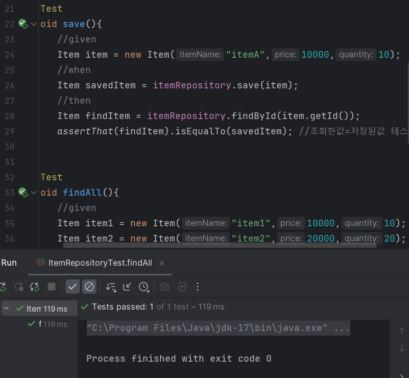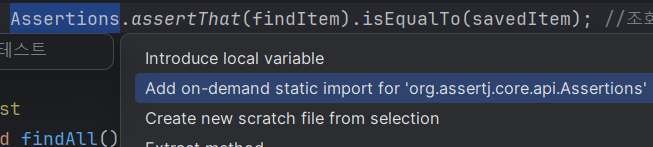 assertThat(findItem).isEqualTo(savedItem); //조회한값=저장된값 테스트