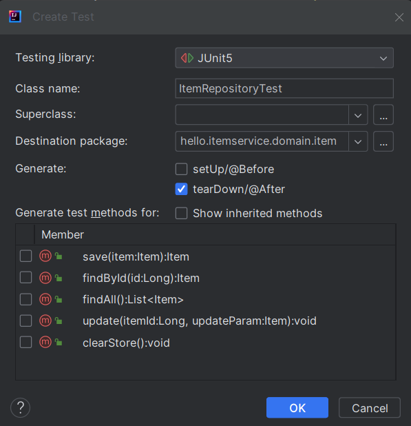 ItemRepository 클래스에 클릭하고 ctrl + shift + T 하면 테스트용 자동완성이 된다 (JUnit5 라이브러리로 하기!)