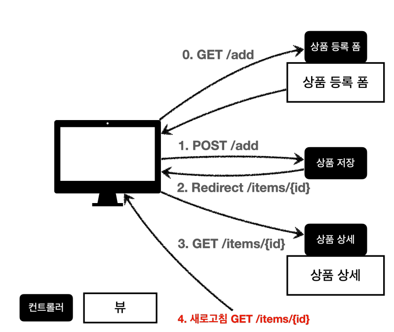 그렇게 하면 상품 등록 후 상품 상세 화면으로 다시 이동해서 (리다이렉트) 마지막에 호출한 GET /items/{id} 이 된다.