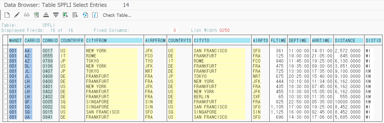 SPFLI 테이블의 실제 데이터들을 볼 수 있다.