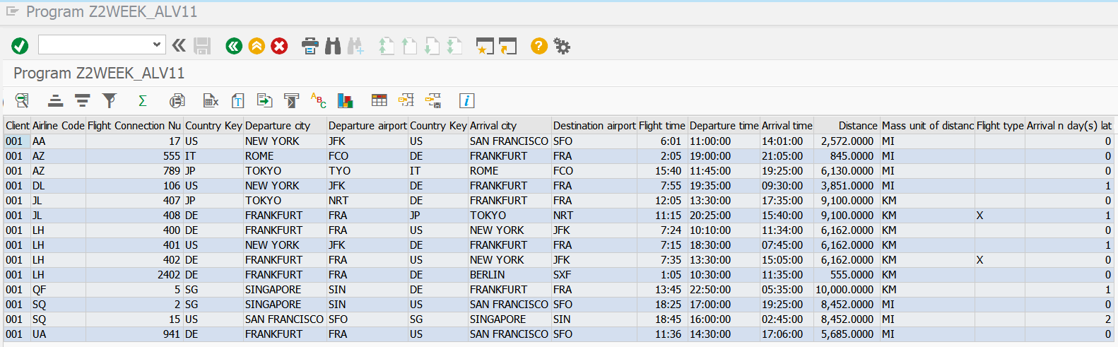4. 내가 생성한 SPFLI 테이블의 데이터를 ALV 형태로 출력한 결과를 확인할 수 있다.