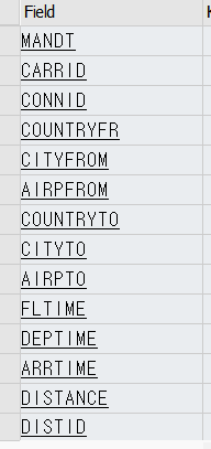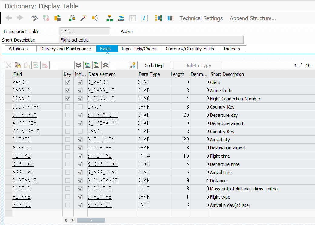 SPFLI 테이블의 필드 정보, 데이터 타입 등 정보들이 나온다