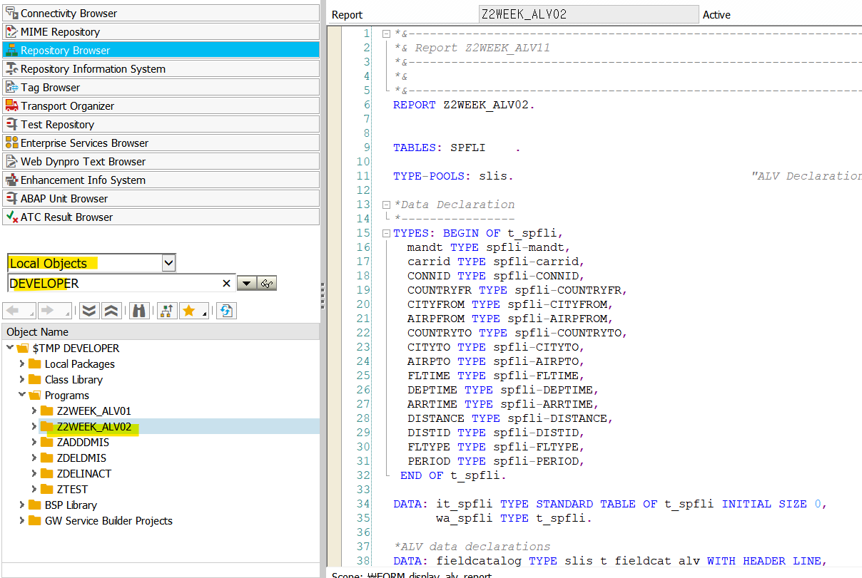 이제 내가 프로그램을 직접 생성해서 SPFLI 테이블의 데이터를 직접 코드를 만들고 ALV를 출력해보자