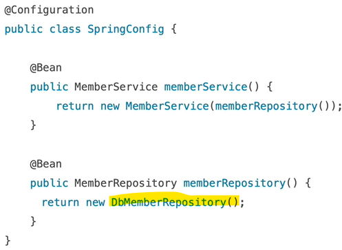 다른 리파지토리로 바꿀때 기존의 코드를 손 안대고 바꿀수있는 법은 DbMemberRepository 만 바꿔주면 됨.