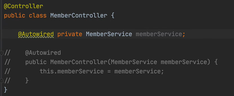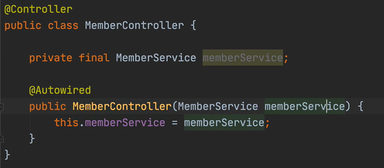 즉 생성자를 통해서 memberService 가 memberController에 주입이된다.