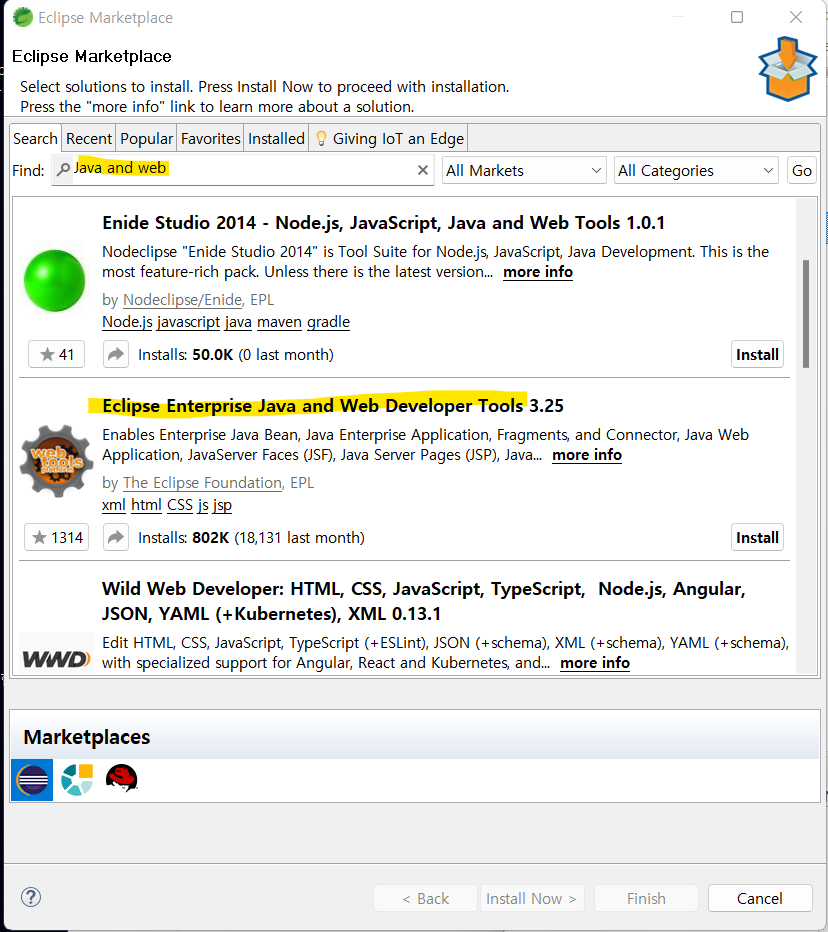 2. Java and web 검색 후 Eclipse Enterprise Java and Web Developer Tools 다운받기